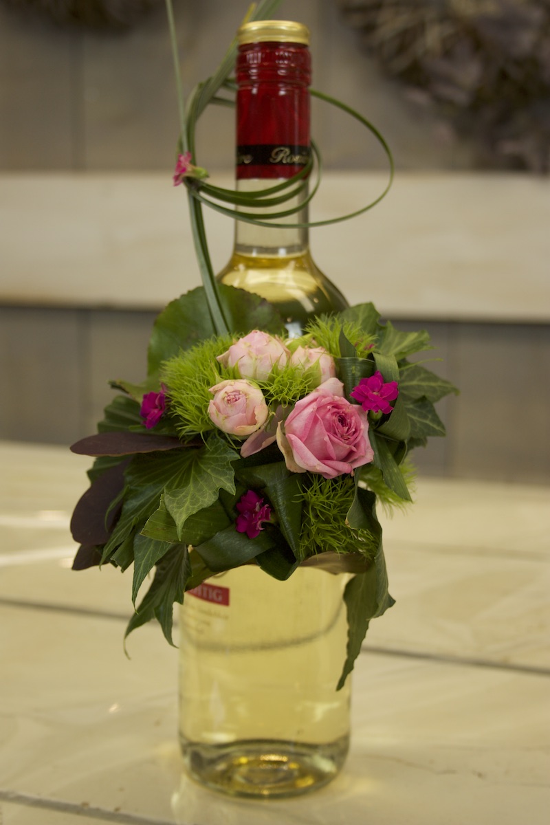 Hoe maak ik een mooi bloemstuk op wijnfles?
