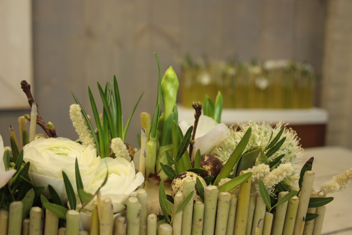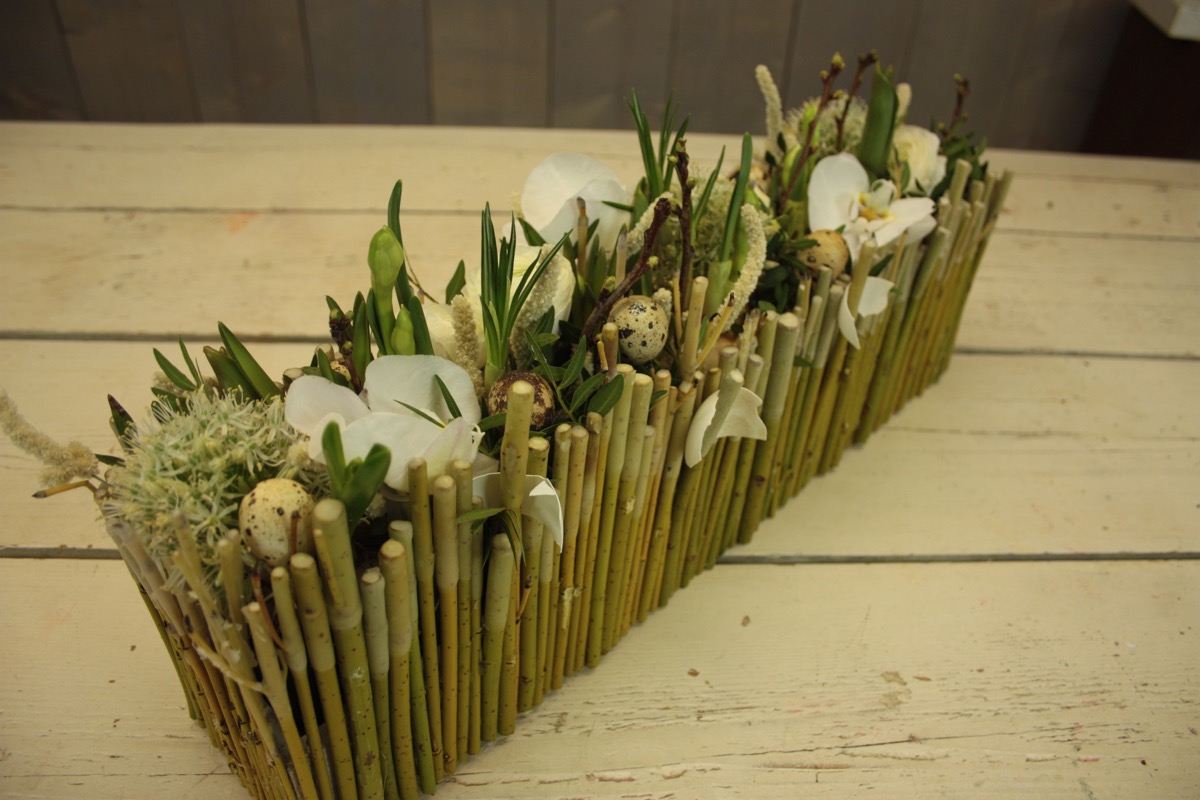 Zelf een modern Paasstuk maken met geknipte takken, opgevuld met voorjaarsbloemen en Phalaenopsis (orchidee).