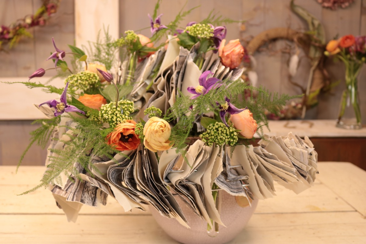 Hoe maak ik een apart bloemstuk mbv papier en bloemen?